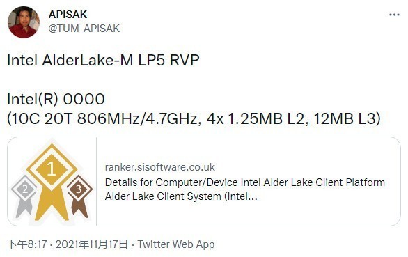 ¡¡¡¡@TUM_APISAKÔÚÉ罻ƽ̨ÉÏ·ÖÏíÁËSiSoftwareÊý¾Ý¿âÖеÄÒ»¿î10ºËоƬ¡£ÓÉÅÜ·ÖÓõIJο¼Ñé֤ƽ̨¿ÉÖª£¬ËüÓ¦¸ÃÊôÓÚÓ¢ÌØ¶ûAlderLake-MÒÆ¶¯CPU²úÆ·Ïß¡ª¡ªÆµÂʸߴï4.7GHz£¬ÇÒÖ§³ÖLPDDR5ÄÚ´æ¡£