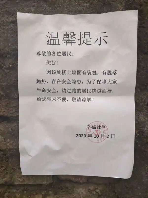 10月2日,幸福社区在对辖区老旧小区进行排查时发现一栋七层楼的墙面存在墙体脱落现象,给进出的住户带来很大的安全隐患。为保障辖区人民群众的生命财产安全,杜绝因墙体脱落造成安全事故的发生,幸福社区立即将危险情况上报办事处,在该路段拉警戒线,放置警示牌,联系清除周围车辆,并在楼栋周围张贴温馨提示,提醒过往居民不要在此逗留,避免发生意外。