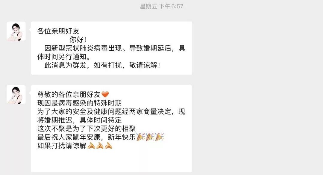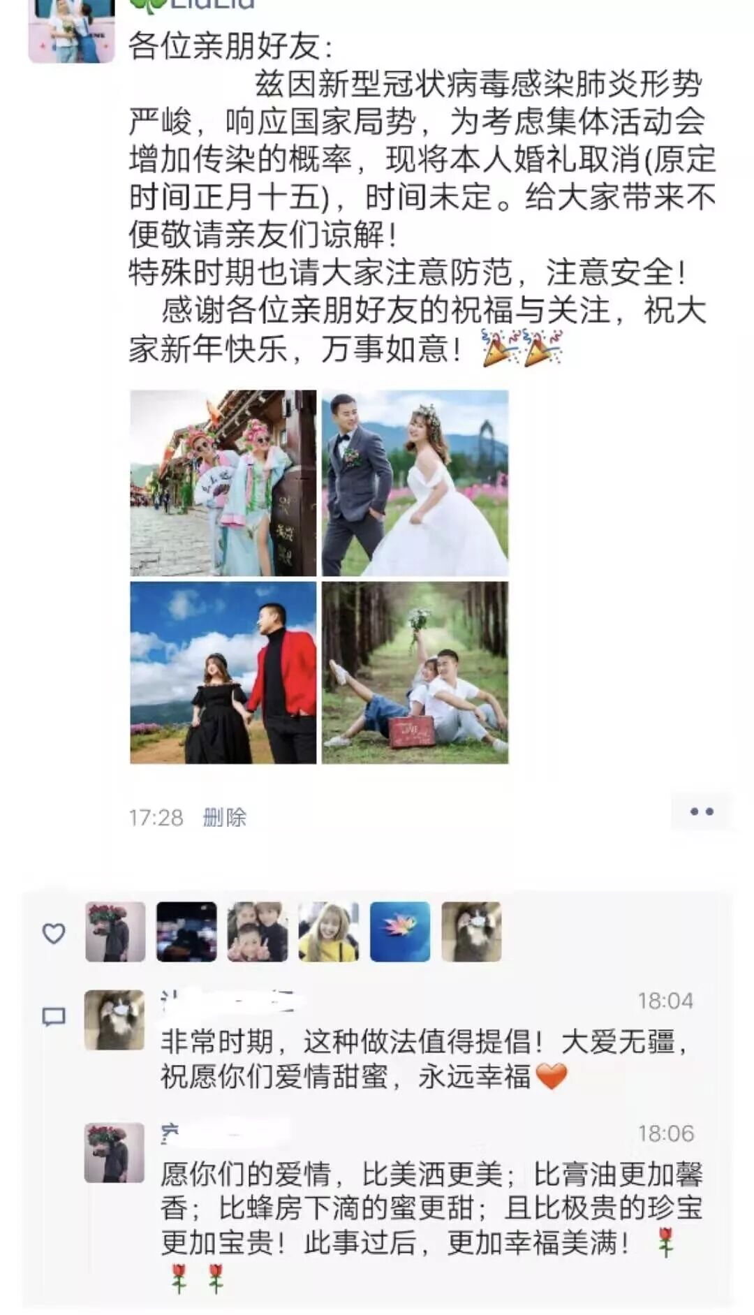 “各位亲朋好友:兹因新型冠状病毒感染肺炎形势严峻,响应国家局势,为考虑集体活动会增加传染的概率,现将本人婚礼取消(原定时间正月十五),时间未定。给大家带来不便敬请亲友们谅解!特殊时期也请大家注意防范,注意安全!”更有新人延迟婚期,亲朋好友都表示支持并送上祝福。