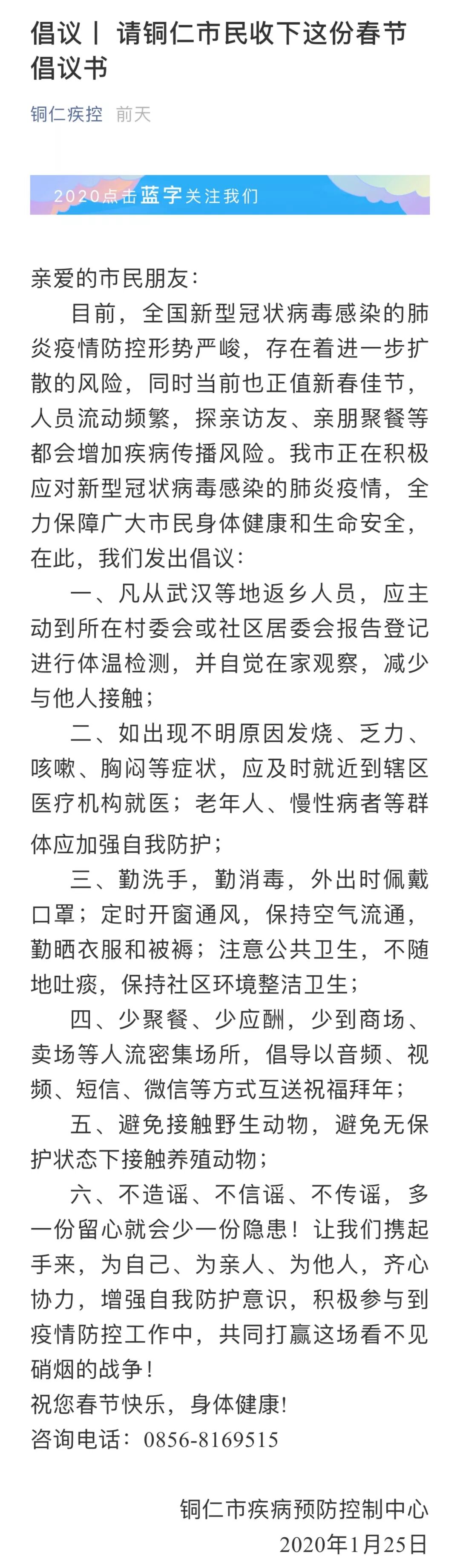 铜仁市疾病预防控制中心发布了致铜仁市民的倡议书,呼吁广大市民听从政府安排,做好防护措施,打赢这场疫情防控关键战役!