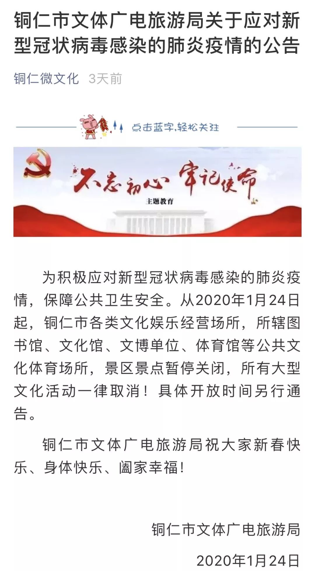 铜仁市文体广电旅游局发出公告:为积极应对新型冠状病毒感染的肺炎疫情,保障公共卫生安全,从2020年1月24日起,铜仁市各类文化娱乐经营场所,所辖图书馆、文化馆、文博单位、体育馆等公共文化体育场所,景区景点暂停关闭,所有大型文化活动一律取消!具体开放时间另行通告。