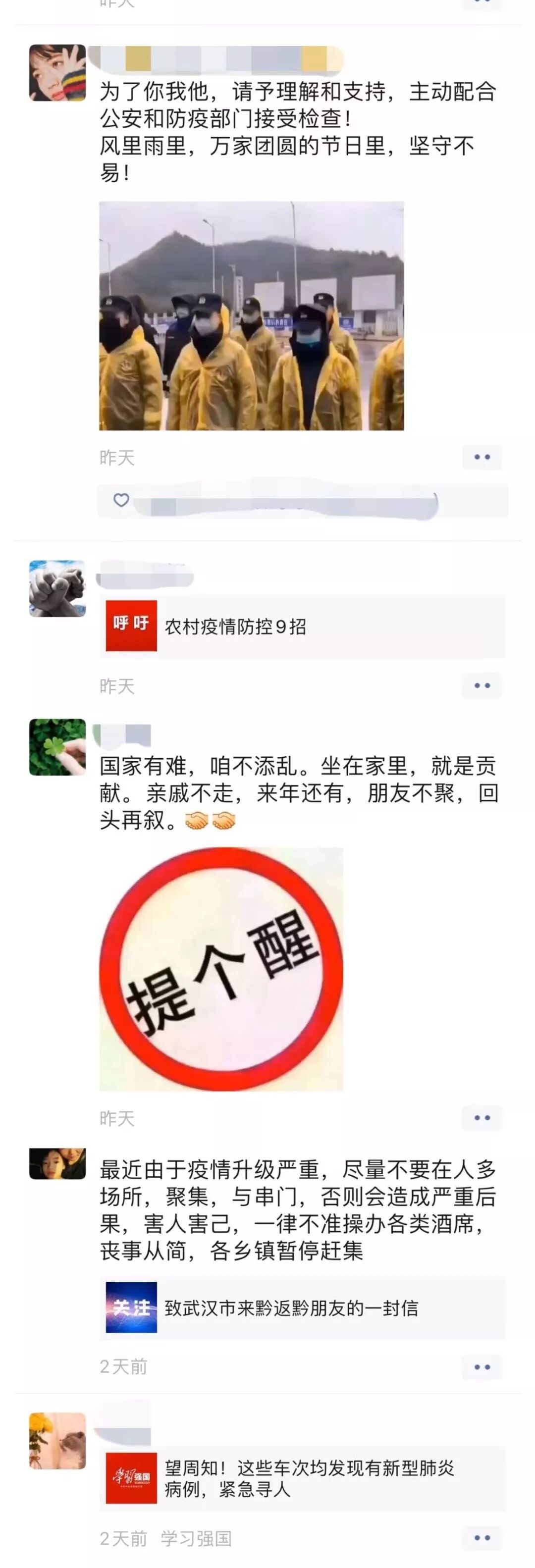 铜仁市积极响应政府倡议,配合防疫工作需要,网络拜年,自觉减少外出、走亲访友拜年、办酒等人员聚集的活动,外出活动时市民们也开始习惯佩戴口罩,为了自己和大家的健康做好防护,自发的在朋友圈里转发防护知识,相互提醒健康与安全。