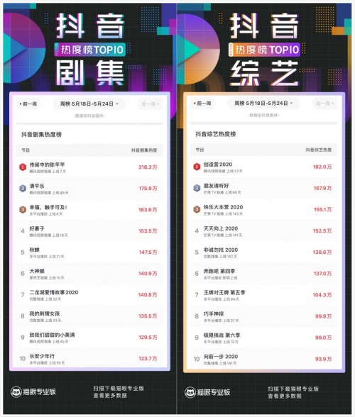 猫眼专业版最新发布的短视频热度周榜显示,5月18日至24日,上线48天的《清平乐》热度不减,位于抖音剧集榜第二,《传闻中的芊芊》与《幸福,触手可及!》两部新剧势头正猛,排名分别为第一和第三,其中《传闻中的芊芊》播出7天内抖音剧集热度飙至218.3万,也是本周唯一超过200万大关的剧集。相比剧集榜,综艺榜变化不大,《创造2020》《朋友请听好》《快乐大本营2020》《天天向上2020》的前四排名顺序已维持两周未变,而《奔跑吧 第四季》和《极限挑战 第六季》则新晋综艺榜前十。