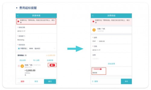 这种情况不仅影响员工关系,而且长此以往公司财务预算必定超额,财务制度更是很难执行。这个时候,一款能控制员工各项费用标准的报销系统就非常nice了,只需将对应费用类型、相关人员的各项费用标准在系统中预置好,系统可根据企业对费用标准管控的力度,支持“刚柔并济”的管控方式,完美解决这一问题——毕竟制度和标准制定的意义就是为了约束,如果没办法约束,那这些标准的制定也就没有意义了。? ? ? ? ? ? ? ? ? ? ? ?